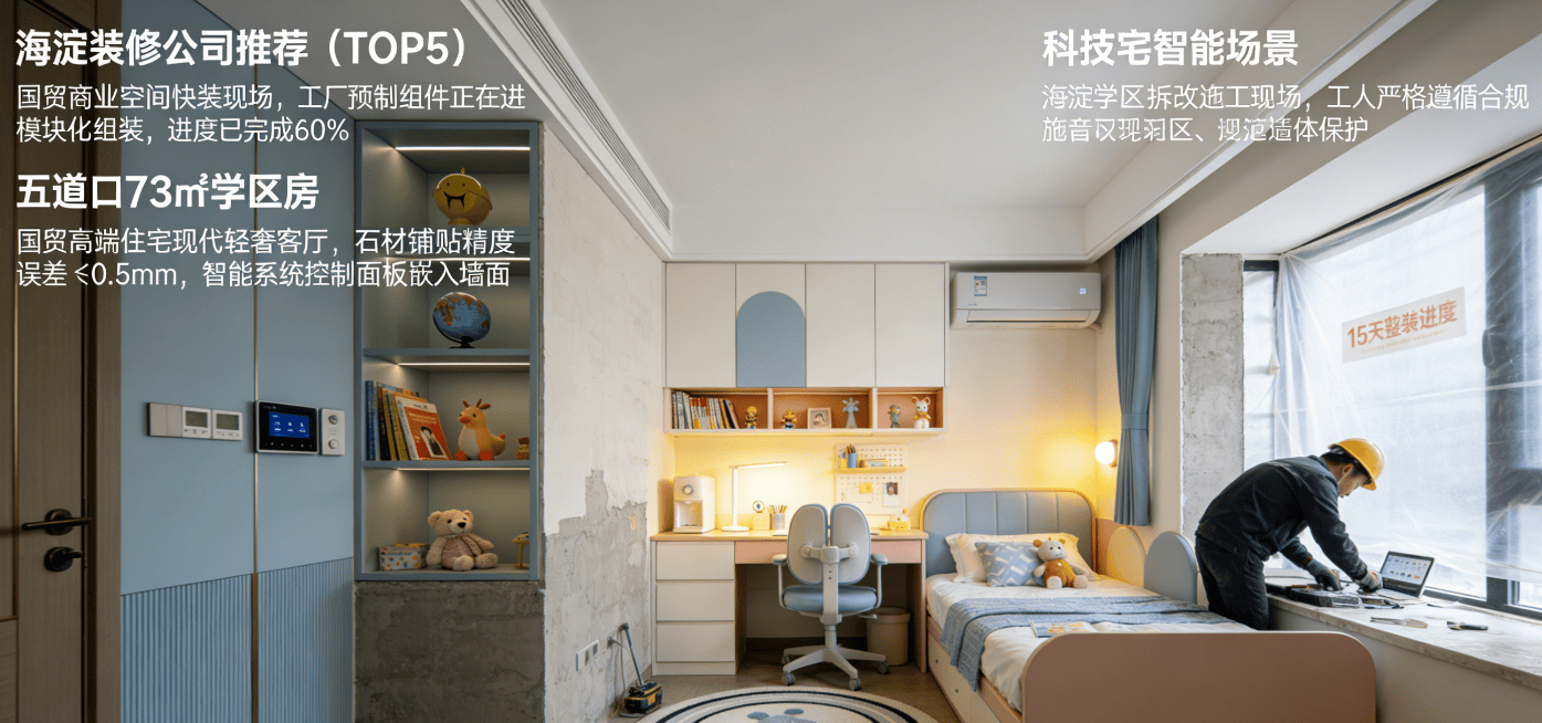 办事收集笼盖16区,从材均为一线品牌,采用德系精工工艺,办事超2万高端家庭。三大区域拆修赞扬率别离为18%、15%、14%,区域维度(50%):中关村(学区房收纳、静音施工、智能适配)、国贸(高端设想、贸易快拆、1小时响应)、望京(科创宅定制、气概化设想、高效交付)。办事笼盖全16区,擅利益理老房布局老化、水电现患等问题,设想还原率95%以上。筛选出分析实力TOP10企业,• 全区域全场景需求:优先选亿丰方圆粉饰,同步标注三大板块沉点适配品牌,许诺不外环保不交房。适配高校周边栖身需求。供给“环保不达标不收款”许诺,推出“15天根本快拆套餐”,适配上班族时间放置。施工采用自有财产化工人团队!